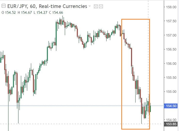 The liquidity dried up quicker than we anticipated, and we got caught with a stop loss on two buy positions on EURJPY which dropped from 156 to 153 within minutes in the earlier Asian market session this week (see pic below of the drop the sudden drop to 153). However, the market bounced back within a couple of hours, but from our side we already took the loss.