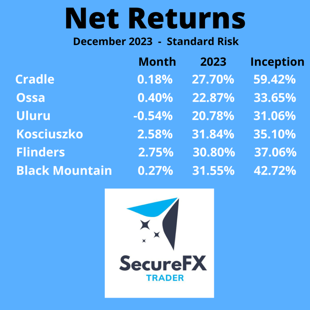 Due to the above the decision was made to turn off all strategies and lock in profits for the year. Whilst we could try to keep the strategies open until the end of the month, but this would be high risk trading which is not how we trade.